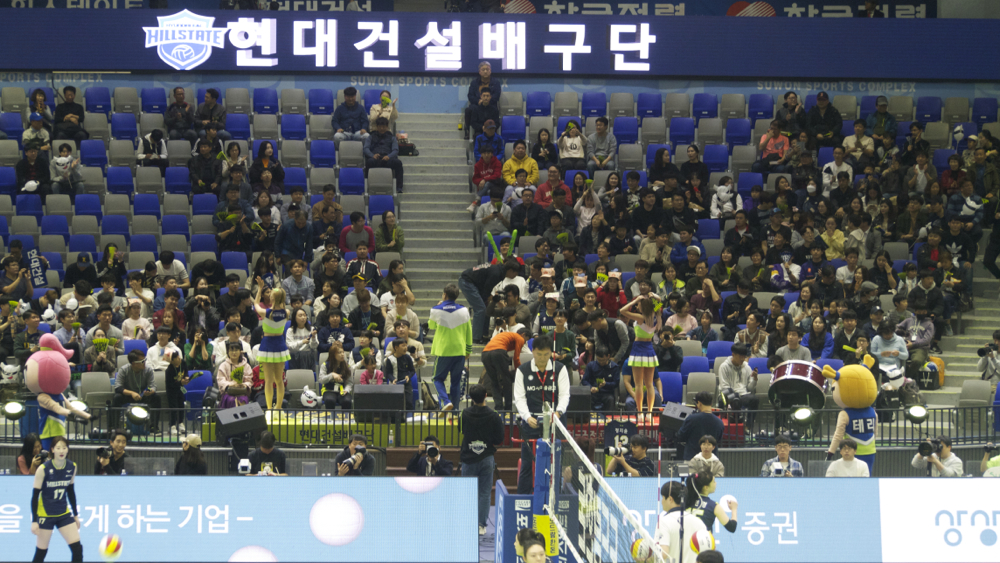 코트 레벨이 아니라서 되게 멀어보일까 걱정했는데, 생각보다는 (사진에 나온 것보다는) 코트가 가까이 보여서 좋았고, 배구 경기할 때 주로 보는 각도라 직관하면서도 일단은 익숙한 View라 자리도 잘 잡았다고 만족. 코트에서는 경기 시작 전 연습을 마치고 그 뒷정리를 하는 중이었다.